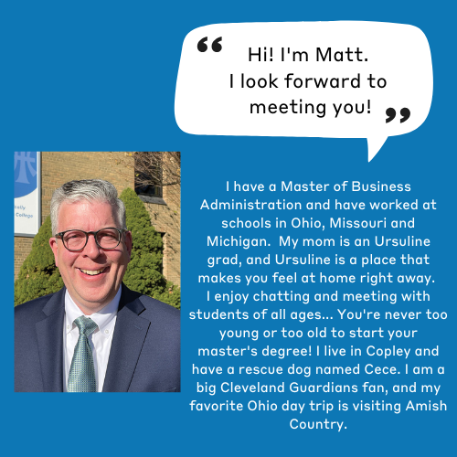 This personal visit experience will provide you with all the information you need to decide if attending Ursuline is the right fit for you. I'll will take you through the process of admission, provide financial aid and scholarship information, as well as give you insights into our values and mission as an institution.